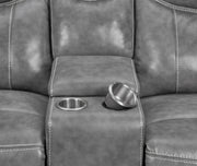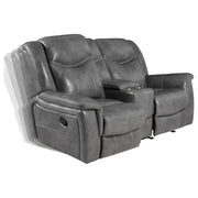 Experience superior comfort and modern convenience with this glider reclining loveseat upholstered in smooth grey faux leather. Designed with plush padded seats, headrests, and armrests, it offers a relaxing and supportive feel. The centre console includes two stainless steel cup holders, a soft-close lift-top compartment with dual AC and USB ports, and a lower storage drawer for added functionality. With a one-inch cool gel memory foam topper, this loveseat delivers lasting comfort and effortless style._x005F_x000D_ Key Features: • Manual glider reclining loveseat blends comfort and functionality • Smooth grey faux leather upholstery enhances modern appeal • Centre console includes dual stainless steel cup holders • Soft-close lift-top storage features two AC and two USB outlets • Hidden storage drawer keeps remotes and accessories organised • Cool gel memory foam topper ensures plush, lasting comfort