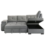 Effortlessly blending beauty and utility, this sleeper sectional invites you to unwind in tailored comfort. Draped in soft grey fabric, its tufted cushions exude quiet elegance, while the generous silhouette offers space to stretch, gather, or dream. Two upholstered stools nest neatly within the armrest, ready for extra seating in an instant. A pull-out bed welcomes overnight guests, and the chaise conceals spacious hidden storage—perfectly designed for life lived beautifully. Key Features: • Sleeper sectional sofa with tufted cushions and clean lines for stylish relaxation • Grey fabric upholstery brings soft texture and versatile modern charm • Pull-out sleeper bed transforms the sofa into a cozy guest accommodation • Lift-up chaise conceals hidden storage for blankets, pillows, or everyday needs • Includes two upholstered stools that nest seamlessly into the sofa armrest • Perfect for compact spaces needing elegant form, comfort, and flexible seating