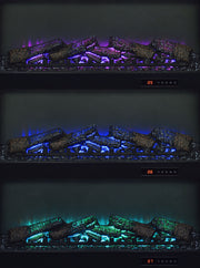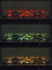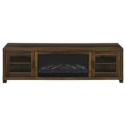 This fireplace TV stand combines rustic charm and modern convenience with a lifelike burning ember display. Finished in rich dark pine, it features two framed tempered glass doors that open to adjustable shelving for media or decor. The central fireplace insert provides visual warmth, all controlled by a convenient wireless remote. With clean lines, black hardware, and integrated cord access, it accommodates TVs up to 80 inches. Please note that there is no heat function included. Key Features: • Fireplace TV stand in dark pine finish with black hardware and contemporary linear styling • Realistic burning ember display without heat functionality delivers visual warmth and ambiance • Wireless remote provides easy control over flame brightness, color settings, and timer function • Two framed tempered glass doors open to adjustable shelves for media or decorative storage • Integrated cord management keeps cables neatly concealed and electronics accessible • Supports flat panel TVs up to eighty inches wide and is crafted from durable engineered materials