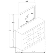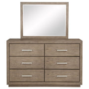 Put a timeless spin on bedroom decor with the refined flair of this modern six-drawer dresser. Designed for neutral appeal that blends into surrounding decor, it features a barley brown wood grain finish. Six drawer fronts are embellished with chrome finish bar pulls for a cohesive look with a touch of texture and depth. The dresser is augmented with a framed mirror on top, creating reflectivity in your bedroom and a spot for styling your daily looks. Add a jewelry box or valet and a bit of decor for a personal touch. Key Features: • Augment your bedroom with the easy, stylish storage featured in this modern six-drawer dresser • Barley brown finish is soft and neutral, offering a fresh palette for the decor of your choice • Six drawers of equal size provide ample storage for clothing, accessories and linens • Mitered trim adds dimension while chrome finish bar pulls complete the look • Recessed base lightens the look while a wide top with a framed mirror is ideal for personal decor