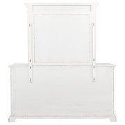 Rooted in traditional elegance, this dresser and mirror set brings vintage charm and refined detail to the bedroom. Framed with ornate carvings and softened by a distressed white finish, the six-drawer dresser offers ample storage with thoughtful touches—including a hidden jewelry tray in the bottom drawer. Antique bronze pulls and crown molding complete the look. Crafted from poplar and engineered wood, it’s designed with both beauty and function in mind. Key Features: • Six-drawer dresser and mirror set with ornate trim and traditional crown molding • Vintage white finish offers aged character with soft, antique-inspired appeal • Antique bronze drawer pulls provide contrast and decorative visual weight • Bottom drawer includes hidden jewelry tray for organized, concealed storage • Felt-lined top drawers and smooth glides add elevated function to daily use • Crafted from poplar, engineered wood, and mirrored glass for enduring charm