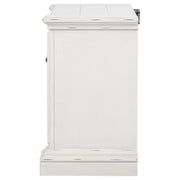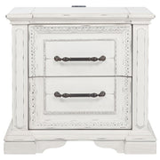Charming and functional, this two-drawer nightstand blends classic design with thoughtful details. A vintage white finish softens the ornate carvings and sculpted base, while antique bronze handles bring graceful contrast. Dual USB ports are hidden at the back for modern convenience, while felt-lined drawers offer protected storage. Built from poplar and engineered wood, it balances timeless beauty with everyday function. Key Features: • Two-drawer nightstand with carved details and sculpted base for traditional appeal • Vintage white finish brings an aged, romantic tone with softly distressed edges • Antique bronze handles add decorative contrast and timeless character • Dual USB charging ports (USB-A and USB-C) discreetly built into the back panel • Felt-lined top drawer and smooth glides ensure soft, functional storage access • Crafted from poplar and engineered wood for durable, heritage-inspired beauty