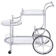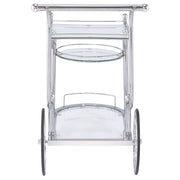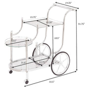 A fun traditional theme offers delightful charm that works perfectly in a traditional or transitional space. This serving cart mimics old fashioned style as it aids in delivering food and spirits to eager guests. Enjoy the captivating look of rustic wheels. Graceful curves create a compelling fluid silhouette on a cart made from metal with finishes in distressed white and chrome. Two tempered glass shelves hold beverages and implements. Key Features: • Carriage style serving cart dazzles with timeless appeal • Chrome finish further enhances classy feel • Three (3) tiers of clear tempered glass shelving with guardrails provide strength and style • Spoke wheels and casters add antique-style detail • Steel and glass construction