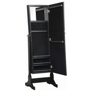 This brilliant multi-function jewelry Cheval mirror serves its purpose(s) in style. It's almost five feet tall, so it's got enough reflection to make sure you look great for stepping out. Open it up to three lower horizontal shelves and enough hooks and right holders for all your precious rings and necklaces. A built-in jewelry box that's four inches deep protects the rest of your precious accessories. Finished in majestic black, it also easily tilts for convenience that's also stylish. Key Features: • Contemporary style with continuous mirrored front against chic black frame • Features full length tilting mirror • Three lower horizontal shelves hold beauty essentials • Plenty of hooks and ring holders for an extensive jewelry collection • 4" deep jewelry box