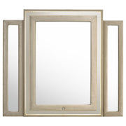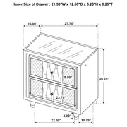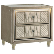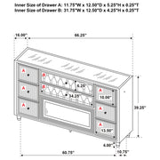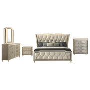 Unite form and function in this bedroom set, where sculpted glamour meets modern refinement. Each piece is wrapped in ivory and camel velvet with quilted textures, crystal knobs, and reflective acrylic accents. The dresser features a clear tempered glass top and LED case lighting without the fireplace insert. Combined with the LED wingback bed, USB nightstand, and tri-panel mirror, the set delivers soft sophistication with everyday practicality. Key Features: • Bedroom set upholstered in ivory and camel velvet with quilted fronts and soft sheen • LED-lit wingback bed with tufted crown and sculpted sides creates a dramatic focal point • Dresser features eight drawers, LED trim, and a clear tempered glass top surface • Nightstand includes dual USB ports with USB-A and USB-C for smart device charging • Mirror includes tri-panel design with built-in LED light for bright, flattering view • Solid rubberwood legs, crystal knobs, dovetail drawers, and heavy-duty glides enhance durability