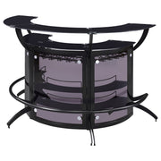Presenting plenty of contemporary vibes, this home bar is sleek in every aspect. The black finish and acrylic construction give this piece an upscale look and feel. A rounded design offers storage space on multiple shelving units. Also included on this contemporary bar table are stemware racks to hold plenty of wine glasses. Whether you are entertaining a party of two or many, this contemporary bar table is the right choice for a stylish home.