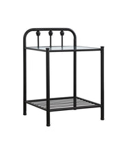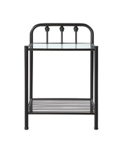 This metal nightstand brings farmhouse charm and functional design to your bedside. Crafted with a dark bronze powder-coated frame, it features a clear tempered glass top for open visibility and easy cleaning. A lower slatted metal shelf adds extra storage for books or essentials. With its vertical rod accents and rounded corners, this table offers durability and vintage character for any bedroom space.