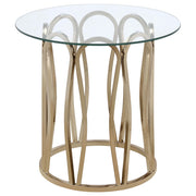 This coffee table set features a round design with clear tempered glass tops supported by sturdy metal frames. The frames are finished in electroplated chocolate chrome, delivering a sophisticated, deeper brass tone. The geometric base design on both tables adds a contemporary touch, while the tempered glass tops provide durability and easy maintenance. These tables offer functional elegance, making them an excellent addition to any living room or lounge area.