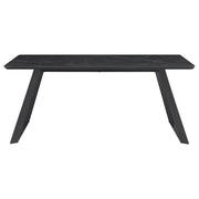 Refresh the look and feel of a modern dining room with a contemporary seven-piece dining set in black and gray. Its rectangular table features a china ceramic finish tabletop with rounded corners for an inviting look. It stands on open frame U-shaped legs that splay for added angularity. Chairs are a comfortable and inviting design, complete with dimensional gray fabric upholstery. Rounded backs offer impressive comfort, while foam cushions ensure softness and inviting ambiance in a kitchen or dining room.