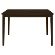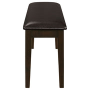 This five-piece dining set brings a perfect blend of everyday comfort and timeless style. Crafted from solid rubberwood, engineered wood, and okume veneer, the rectangular table features clean lines and tapered legs in a rich cappuccino finish. The matching chairs and bench offer padded seats upholstered in dark brown leatherette for a warm, inviting look. Ideal for family meals or casual gatherings, this versatile dining set adds a refined yet approachable touch to contemporary or transitional interiors. Key Features: • Five-piece dining set combines timeless design with modern everyday functionality • Rectangular table in cappuccino finish features clean lines and bold tapered legs • Crafted from rubberwood, engineered wood, and okume veneer for durable strength • Ladder-back chairs include padded seats in dark brown leatherette upholstery • Matching bench adds flexibility and extra seating for casual dining gatherings • Perfect for family meals or hosting guests in transitional or modern interiors