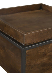 Versatile and perfect for compact homes and spaces, this accent table offers up plenty of interior storage. Designed with a minimalist aesthetic, this accent table features an open cube-inspired iron base with slim corner frame edges in a gunmetal finish. A hidden X-shape support floats the main wood feature, an eco-friendly mango wood storage area with a tray top, which offers a rustic charm with its dark brown finish. A removable tray top invites you to store throws, linens and more inside. A perfect addition for multipurpose spaces like guestroom home offices and other compact rooms. Key Features: • Side table with a round, genuine brown marble top featuring elegant veining • Solid mango wood shelf with a warm brown finish for added storage space • Sturdy metal frame in a dark gunmetal finish with X-style supports • Versatile design suitable as a nightstand, accent table, or plant stand • Compact size fits easily in living rooms, bedrooms, or office spaces • Ideal for organizing books, plants, or decorative items while saving space