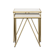 A perfect fusion of modern elegance and timeless luxury, this two-piece nesting table set brings a sophisticated touch to any space. The rectangular white marble tops exude refined beauty, while the sleek gold-finished iron bases feature angled, open-frame designs for a light and airy aesthetic. Whether stacked together to save space or used separately for added surface area, these tables offer versatility and style. Ideal for contemporary, glam, and classic interiors, this handcrafted nesting table set elevates any living room, bedroom, or lounge area with its opulent materials and geometric design. Key Features: • Genuine white marble tabletops add a luxurious, timeless touch • Sleek gold-finished iron base with an open geometric design • Space-saving nesting function allows for versatile arrangement • Use together or separately to enhance different areas of a room • Perfect for contemporary, glam, and modern interiors • Handcrafted design ensures elegance and durability