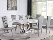 Transform your dining area into a chic space with this elegant, modern glam side chair set. Designed in a classic Parson style silhouette, these two chairs boast a tall curved back for extra comfort and support throughout long dinners. Upholstered in a plush velvet fabric across the seat, these dining chairs also feature lovely details such as button-tufted flared backs for a classic expression. Stainless steel legs in a gleaming polished chrome finish lend a sleek modern touch. Place a set of these stunning glam dining chairs around a table for a magnificent style and comfortable seating. Key Features: • Parson-inspired frame with a flared back offers an updated contemporary expression • Upholstered in a soft velvet fabric for a plush, luxurious look and feel • Button tufted backrest lends a classic touch and hint of texture • A polished chrome finish offers a modern flair to the sophisticated timeless legs