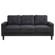 This modern sofa invites relaxation with its crisp profile and playful charm. Slim track arms trimmed in cord welt frame plush, grid-tufted cushions for visual appeal and cozy support. Wrapped in softly textured upholstery, it brings warmth and comfort to smaller living areas. Pocket coil seating ensures supportive structure, while tapered legs create a lifted, stable foundation ideal for everyday lounging. Key Features: • Sofa features slim track arms and grid-tufted cushions for tailored charm and cozy support • Rust finish adds contemporary appeal with a softly textured look and tonal versatility • Cord welt trim outlines each arm and cushion for added structure and subtle definition • Pocket coil seat construction provides lasting comfort with excellent shape retention • Fabric upholstery offers a soft, woven texture that's smooth to the touch and easy to maintain • Sturdy tapered plastic legs give this sofa a stable lift and simple modern foundation