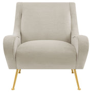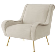 With a stylishly curvy silhouette, this accent chair offers an artisan approach to furnishings in your custom casual or semi-formal space. Embellish a living room or family room with a chic chair creating palette versatility and a romantic ambiance. Relax in style and beauty with a delicious design in seating, starting with plywood framing and soft textured velvet upholstery. Alluring flared silhouetting on its full-length armrests adds comfort in conjunction with an extra-wide build, as a comfy attached seat invites hours of pleasing leisure. Bring in a hint of retro style with slender, splayed gold metal legs and button caps that create a whimsical satellite effect. Key Features: • Stylishly curvy silhouette for custom casual or semi-formal space • Plywood framing and soft textured velvet upholstery for chic chair • Alluring flared silhouetting on full-length armrests for comfort • Extra-wide build with comfy attached seat for hours of leisure • Slender, splayed gold metal legs and button caps for retro style