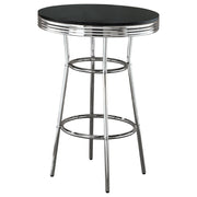 Reminiscent of a 50s soda fountain, this bar table offers a variety of uses. It's perfect for a handy place to prop drinks or snacks. Its sleek design gives you the flexibility to move around freely. A high-shine chrome base and white table top will allow you to enjoy your breakfast and morning coffee in style. Pair it with matching chrome barstools to further accent your space. Key Features: • Round bar table with white laminate veneer top and classic chrome apron trim • Retro 1950s-inspired styling ideal for bistro setups or casual dining areas • Electroplated chrome metal legs include mid and lower support rings • Pub height design pairs easily with coordinating counter or bar stools • Laminated engineered wood tabletop offers durability and easy maintenance • Crafted from chrome steel, engineered wood, and laminate veneer