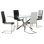 This contemporary five-piece dining set showcasing chrome and glass makes the perfect showpiece in a modern home. The set includes a rectangular glass table and four shapely chairs that are visually stunning. The rectangular extra thick tempered glass of the tabletop virtually “floats" on a chrome finish asterisk metal base that steals the show. The four chairs feature shapely lines and channel stitching in contrasting black and white leatherette for a stunning contrast. The base and legs are crafted with a lustrous chrome finish that imbues your dining space with glam and pizzazz.
