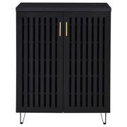 Transform your foyer or hallway with this versatile shoe cabinet, designed to keep your footwear organized and out of sight while complementing a variety of interior styles. Behind its distinctive vertical-slatted doors, multiple adjustable shelves provide ample room for everything from everyday sneakers to formal footwear. Crafted from engineered wood with a durable laminate veneer, it rests on slender metal legs, creating a balanced silhouette that enhances both form and function.