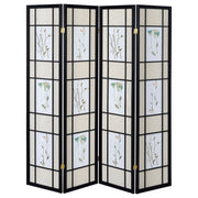 The world may be getting smaller, but some things still warrant privacy. Put on makeup or fill up a diary in secret behind this four-panel screen. Framed in black, panels can be pulled close or extended to customize your secrecy. Panel screens come in a floral print that's feminine and artsy. Use it to divide a room or put in front of a window to keep things intimate. Key Features: • Four panel screen with printed floral detail • Wood frame in black finish • Floral fabric panels framed in stained glass style • FSC certified wood frame • Rubberwood construction