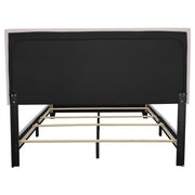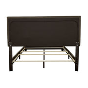 Embrace a relaxed modern style with the smooth edges from this upholstered bed frame. Complete with solid wood legs in black finish, the open frame warms up spaces with simplicity. Chic and individually placed, the chrome nailhead trim adds pops of metallic radiance along the fabric-covered headboard. Constructed of smooth rectangles, the open silhouette feels calm and welcoming. Neutral and soft hues ensure that traditional and contemporary design schemes are maintained. Key Features: • Upholstered bed in charcoal fabric • Individually driven chrome nailhead trim • Plywood and MDF frame • Requires box spring • Available in ivory, charcoal, grey, and brown fabric