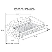 Sweeping lines and timeless details come together in this transitional twin daybed and trundle set. Wrapped in a soft fabric that coordinates with all sorts of color palettes, this daybed and trundle combo lends traditional elements such as a button-tufted back and sides. Thin sloped sides and a camelback offer a graceful design and feminine charm to compact rooms where additional sleeping arrangements come in handy. Tucked beneath the main frame is a hidden trundle set, easily retrievable and concealed by a smooth padded panel. Black legs elevate the trundle bed ever so slightly, allowing finished floors and colorful rugs to shine through. Key Features: • A transitional camel back with button tufted detailing, creates a cozy focal point for any guest room or smaller sized area • Functional convenient pull out trundle for an extra sleep space when needed • Upholstered in a versatile grey fabric • Constructed with poplar and MDF • Slat kits included