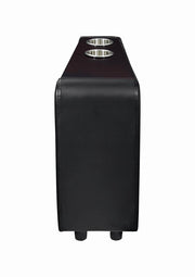 Enhance your home theater setup with this versatile wedge console, designed to fit seamlessly between two recliners. Upholstered in sleek black leatherette, it features dual stainless steel cupholders and a memory foam-padded top for added comfort. Enjoy the convenience and luxury of a personal entertainment hub.